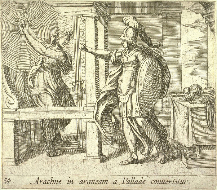 过去,吕底亚城中居住着一个叫做“阿莱克涅”的姑娘,这个姑娘织出来的布无人能及,所以人们称赞她为“雅典娜的学生”。阿莱克涅听了却不高兴,她认为她的本领全来自于自身,凭什么称她为“雅典娜的学生”呢?如果把雅典娜叫过来和她比试一下织布,说不定雅典娜还比不上她呢。雅典娜听到这话,就下凡跟阿莱克涅进行比试。没想到阿莱克涅的技艺了得,织出来的布果真比女神的布更加精美。输掉比赛的雅典娜气急败坏,对阿莱克涅说道:“既然你那么喜欢织布,就永远织下去吧。”说完,她把阿莱克涅变成了一只蜘蛛。蜘蛛从腹部抽出丝线,然后结成网,故而被视为自然界里的织工,很多神话也将蜘蛛和纺织联系在一起,例如:非洲的阿桑特人就认为是蜘蛛神阿南西教会他们纺织的。美国亚利桑那州的那瓦霍人也相信是一位蜘蛛女神将纺织技艺传授给人类的,她的丈夫蜘蛛男神则创造了世界上第一架织布机,阳光就是这架织布机上的经线。