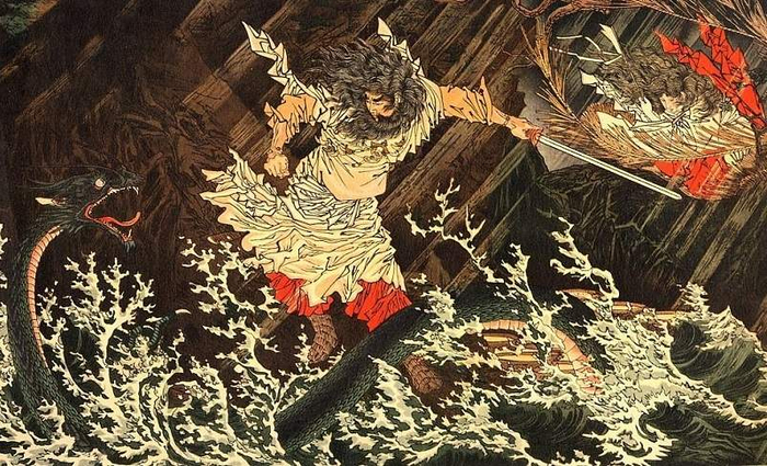 须佐之男到高天原去拜访他的姐姐太阳女神天照,但天照误以为须佐之男是来跟自己争夺神界统治权的。误会虽然很快澄清了,须佐之男心里却留下了疙瘩。于是他故意在高天原四处调皮捣蛋。有一回,稚日女尊在织布时,须佐之男偷偷爬上屋顶,将一匹剥了皮的马扔了下来。稚日女尊受到惊吓,不慎被梭子刺中了阴部而死。天照女神得知后,气得躲进了山洞里,整个世界顿时陷入了黑暗。