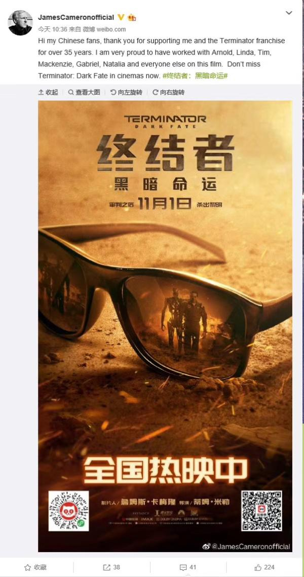 卡梅隆在微博上推荐《终结者:黑暗命运》