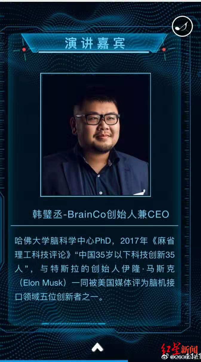 红星新闻记者通过企查查搜索公司创始人韩璧丞,资料显示其拥有7年医疗设备研发经验,在医疗设备领域取得多项专利。公开资料显示,创始人韩璧丞为哈佛大学脑科学中心博士,世界首位就脑机接口技术接受美国福布斯专访的华人科学家,入选2017年《麻省理工科技评论》35名35岁以下科技创新者。据21世纪经济报道,韩璧丞是黑龙江省牡丹江人,大学本科在韩国科学技术院读本科,并结识美国哈佛大学博士生导师,然后经导师推荐进入美国哈佛大学从事脑科学研究。