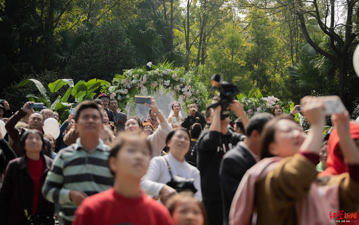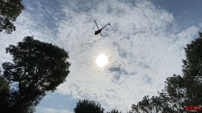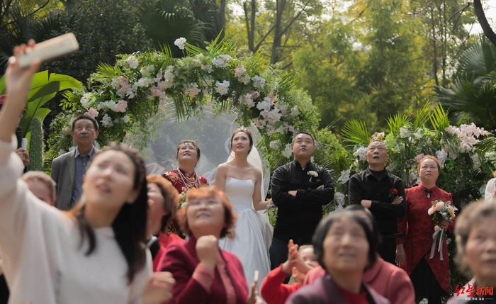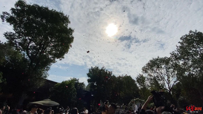 2日上午,在成都三圣乡的一处婚礼现场,红包和鲜花从盘旋在空中的直升飞机上撒下。所有人或目不转睛的盯着飞机,或高举手机,甚至当红包飘落,大家都忘记抢了。