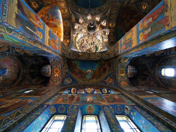 回到圣彼得堡,在主干道涅瓦大街不远处的格里鲍耶陀夫运河旁,有一座神似莫斯科圣瓦西里大教堂的红漆洋葱顶教堂,这是圣彼得堡的又一地标建筑——滴血大教堂。它虽外形与前者相似,但内部却是别有洞天。