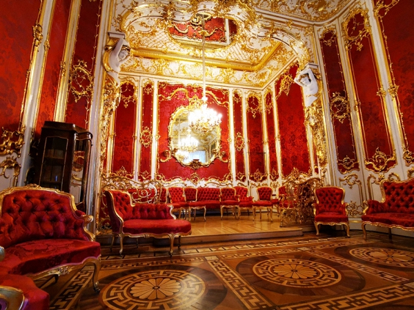 倘若客人们想坐下来和沙皇饮茶畅谈,冬宫也有众多大大小小的会客厅满足需求,其中颇具代表性的是玛丽亚皇后客厅。这个房间的奢华风格与大金銮殿一脉相承,纷繁复杂的金纹镶嵌在暗红色内壁上,又映入主墙上椭圆镜子,在水晶吊灯的照耀下显得格外气派。