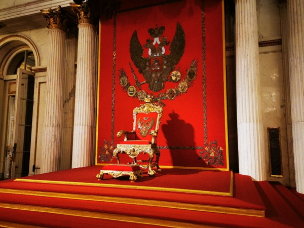 拾级而上,映入眼帘的便是有“大金銮殿”之称的圣乔治大厅,是冬宫的心脏所在。大殿建于叶卡捷琳娜二世在位时期,用来举行最高等级的皇家仪式、招待会和御前会议等。正中央摆放着黄金宝座,椅背及后壁上有双头鹰国徽,处处透露着帝国威严。