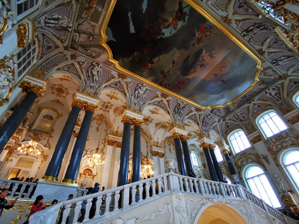 冬宫共开放三层,其中一层和三层分别是考古出土文物和东方(包括伊斯兰和东亚文明)器具,而绝大多数精华都在二层的沙皇私人博物馆和寝宫。从一层到二层,就要经过第一件镇馆之宝——约旦阶梯。在冬宫尚未对外开放时,这里是冬宫的真正入口,专以接待外国使节和皇室显贵。灰泥拱顶、鎏金壁灯、大理石柱和浮雕神像构建了一个神圣庄严的大门。在穹顶上则绘有提香·韦切利奥的名作《奥林匹斯山》,描绘了诸神在宙斯身边众星拱月般集结,象征帝国对沙皇的拥戴和忠诚。