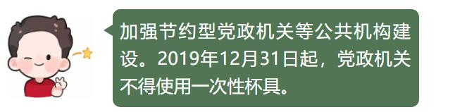 自2019年12月31日起,不得使用一次性杯具,单位内部办公场所、会议室接待统一使用瓷杯或玻璃杯,倡导干部职工办公或开会自带水杯。