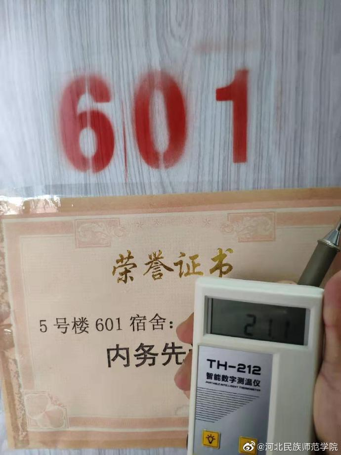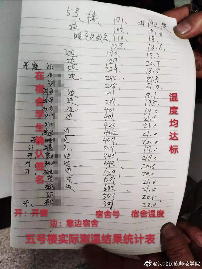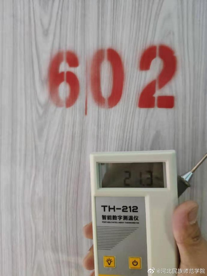 河北民族师范学校多次与供热公司、能源管控公司协商,供热公司承诺提高供水温度,确保供暖效果,在保证室内温度的前提下,科学调控,随时关注供热状况。经过努力,2019年,河北民族师范学院成为我市唯一实行弹性供热的学校(包括中小学在内)。从10月18日就开始供暖,学校相关部门及热力公司多次到宿舍实地测温,宿舍温度已达到了供热标准。网上事件持续发酵后,11月2日,供热公司又安排8个组,采取拉网式测量,测量结果都在18度以上。国家《采暖通风与空气调节设计规范》规定,一般居民起居室、客厅采暖温度不低于18度。办公、公建室内采暖温度不低于16度。《河北省供热管理办法》规定,一般居民起居室、客厅采暖温度不低于18度。目前,河北民族师范学院学生宿舍供暖温度完全符合规定供热标准。