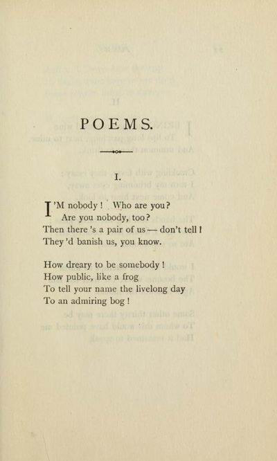 这是个复杂的产生意义的场域。我们在这三个相互关联的维度里体验声音:认识论上的,把声音解读为先前脑海中储存的信息的能指(signifier);声学上的,就是以听觉的特质来对应身体或情感上的反应,这些特质包括音色、振动、节奏、音高、音频、和声等等;联觉上的,也就是说,把其他同时出现的感官关联进来,比如视觉图像、气味、味道、触觉记忆。最后的这个维度常常是自发的,也需凭借直觉。文本经由元音、辅音、音节、标点符号、抑扬等产生声音。以我非常喜欢的艾米丽·狄金森(Emily Dickinson)的一首诗为例: