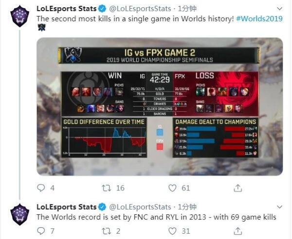 IG唯一获胜的第二局中,双方鏖战42分钟,共产生了59次击杀。在S赛9年历史中,这个数据排在了最多单局击杀的第二位,此前只有S3时期皇族和FNC的半决赛单局产生过69次击杀。