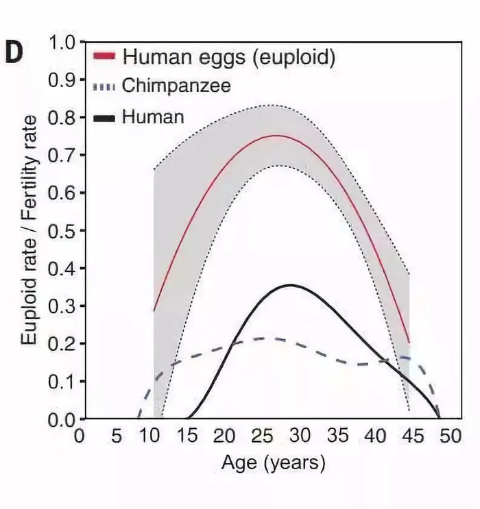 年龄与染色体整倍体率/生育能力的关系。红色和黑色曲线分别为人类染色体整倍体率和生育能力曲线,而灰色虚线则为黑猩猩的生育能力曲线,相对平缓得多。