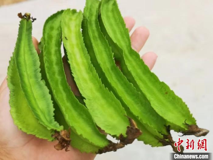 据介绍,杨桃豆实为龙豆,因其豆荚长得像杨桃而得名,又称四棱豆、四角豆、四瓣豆、翼豆、翅豆、皇帝豆、香龙豆等。杨桃豆为藤本作物,需搭架种植,其花为淡紫色,豆荚一般有十几厘米长、两三厘米宽,呈带棱的长条方形四面体,嫩荚为浅绿色,棱缘呈翼状且有疏锯齿,老荚颜色明显变深。因其富含蛋白质、多种维生素和铁、钙、锌、磷、钾等矿物质,营养价值较高,被誉为“绿色金子”。