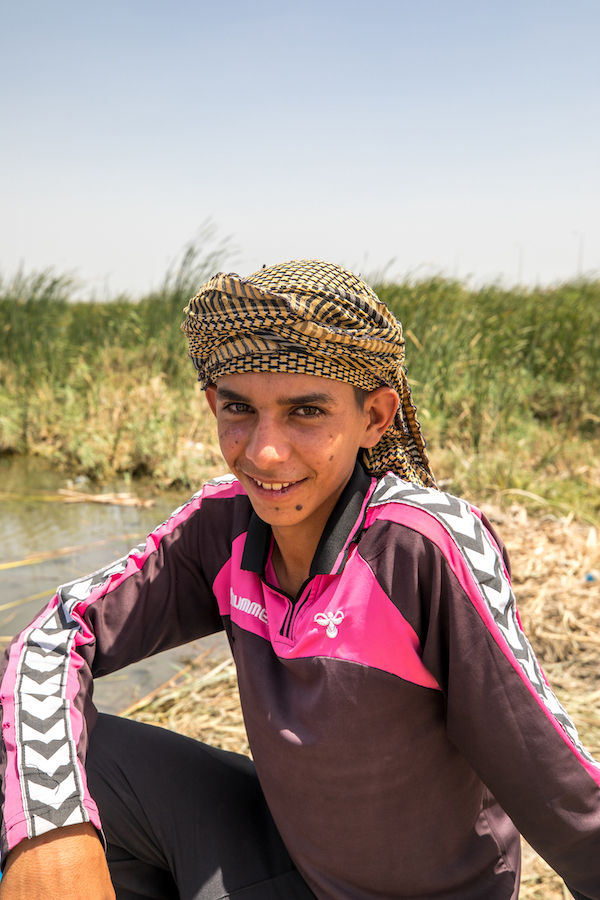 到达目的地——三片大沼泽中最大的中央沼泽后,两位伊拉克朋友帮我张罗着寻找船只。过一会儿,他们找来了一个15岁的沼泽阿拉伯男孩,他没有穿传统阿拉伯长袍,而是身着一套运动服,戴着黄黑相间的阿拉伯头巾,一双美丽的褐色大眼睛深邃迷人。