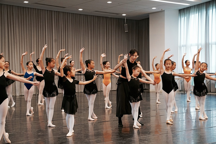 朱洁静则带领孩子们做了一组中国民族舞组合练习,她说,“中国民族舞的脚步和芭蕾舞是完全一样的,但差别在于上半身,民族舞更讲究流畅和灵动,芭蕾注重力量,注重节奏。”