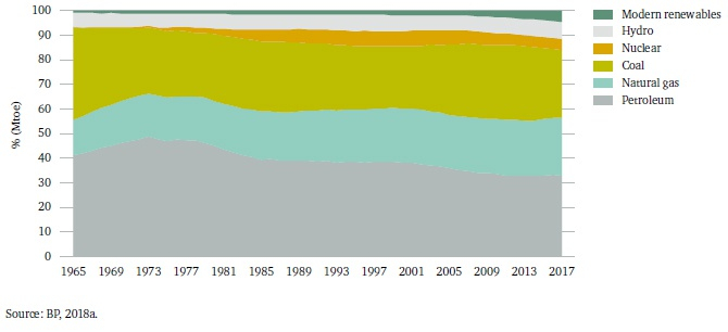 图1. 全球初级能源消费(1965-2017)。右上图例,从上至下:现代可再生能源、水力、核能、煤、天然气、石油。