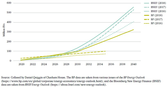 图2. 两大预测机构对全球电动车保有量的预测。右上图例,自上而下:彭博新能源金融(BNEF)2018、2017、2016;英国石油公司(BP)2018、2017、2016。
