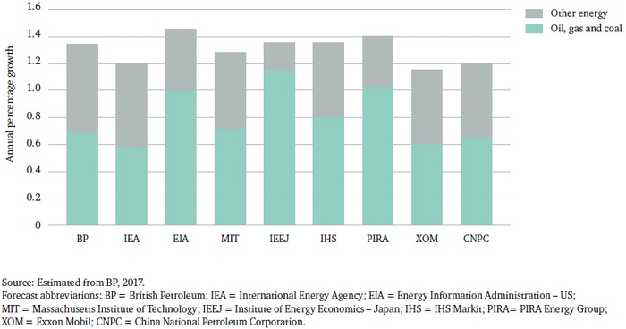 图4.各机构预测2015至2035年能源消费增长份额。机构名称缩写,自左至右:英国石油公司、国际能源署、能源信息署(美国)、麻省理工学院(美国)、能源经济研究所(日本)、IHS Markit(英国)、PIRA能源集团(美国)、埃克森美孚(美国)、中国石油天然气集团。左轴:年增长率。右上图例,从上至下:其他能源;石油、天然气和煤。