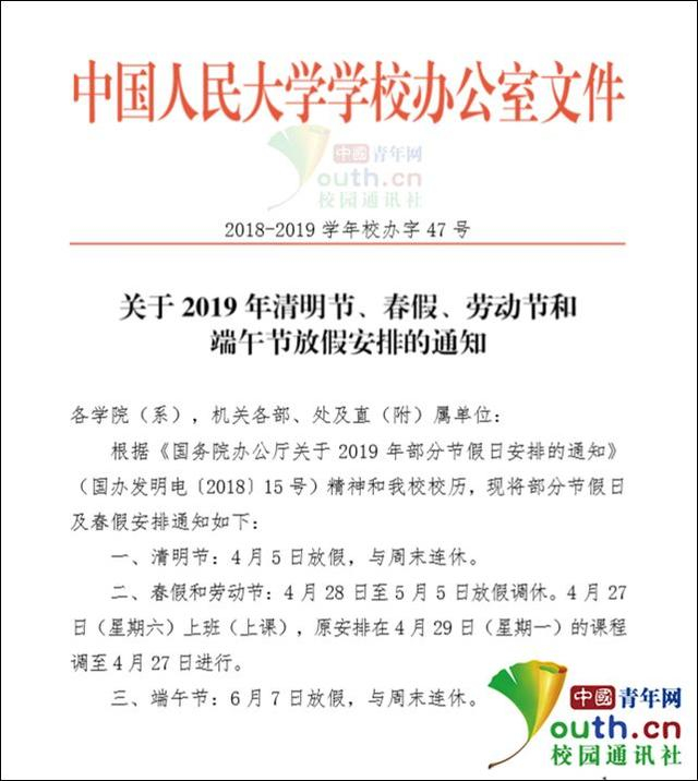 图为中国人民大学放假通知。中国青年网记者 李华锡 供图