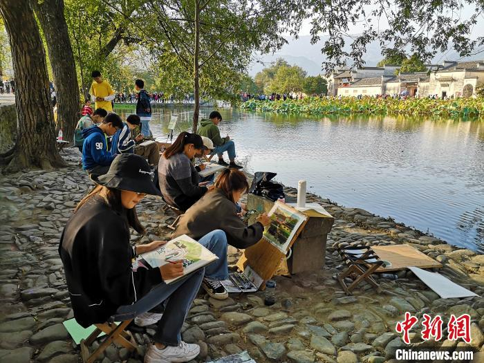 中新网黄山11月4日电 (张强 胡婷 韩丹妮)11月4日,阳光明媚,清晨的雾气才刚刚散去,在安徽省黄山市黟县南湖旁就围满了来自全国各地的写生学生,他们的画笔描绘美丽乡村,以艺术的形式留住乡愁。