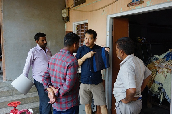在印度的工厂里,暴岩与工作人员正在沟通。