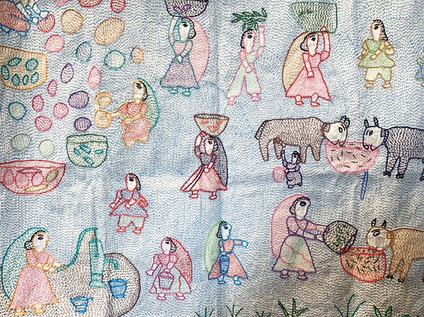 来自西孟加拉邦的刺绣,图案反映出农村地区的传统生活场景。