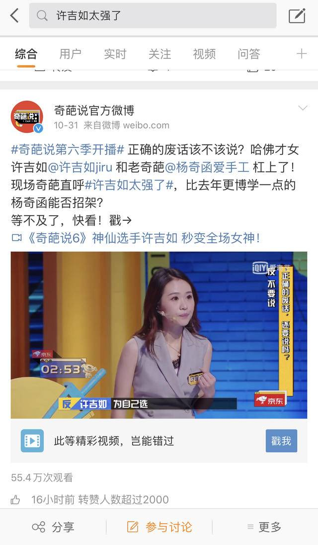 在最新一期的《奇葩说》播出后,许吉如又火了!许吉如抛出一个观点:“正确的废话还要说吗,一道典型的选择题。成年人做选择题为谁选,为自己选。不说废话是我对自己的要求,不会成为我对别人的指责和绑架。”犀利的观点,精彩的表现让许吉如疯狂圈粉,同时“许吉如太强了”登上微博热搜榜,引来网友的崇拜和羡慕。有网友说:“大家听听她说的这些,逻辑清晰,中间没有任何间断,头头是道,听的马上都要同意她了,感觉她是这季的黑马。”还有人表示:“许吉如是非常精英气质的辩手,带着金字塔顶端的优雅,知识输出密度大,语言论点和逻辑一丝不苟。看好她的潜力。”