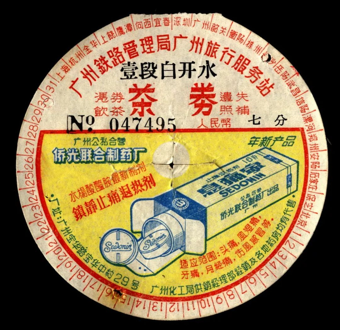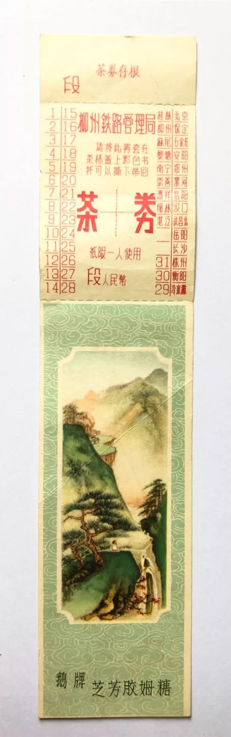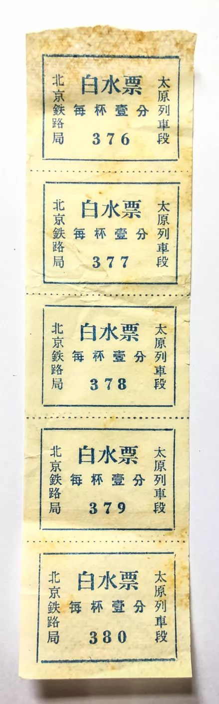 列车在车站购水需开具上水票,为解决旅客饮水问题,当时全国各旅客服务段、服务所纷纷想办法,最后决定用段茶票(也叫茶券)来解决,喝多少买多少。把全部旅程分为若干段,段茶票分半段、1段、2段、3段、4段,目前发现的最长距离为5段票,可从北京喝到广州。