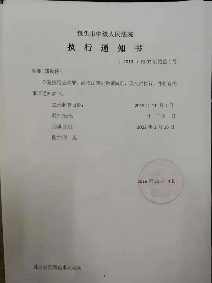 “2019年1月21日,包头市人民检察院认为本院对罪犯郑俊怀作出的上述两次减刑裁定不当,向包头市中级人民法院提出纠正意见,建议依法重新审理。”在上述文号的包头中院刑事裁定书中,该院表述称:“包头市人民检察院认为,萨拉齐监狱有关工作人员捏造虚假事实,编造改造表现材料,违法为罪犯郑俊怀报请减刑,严重违反了有关法律规定。”