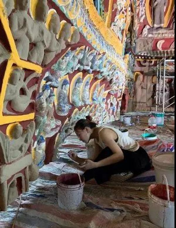 然而,让3D打印无法将色彩打印在立体雕刻上,只能需要相关专业人员通过手工绘制色彩,来恢复石窟样貌。据云冈石窟公布的资料介绍,这是有史以来的第一次,从2019年3月底到10月底,历时8个月,云冈石窟研究院派出一支平均年龄为29岁的美术工作队伍奔赴深圳为打印出来的石窟上颜色。
