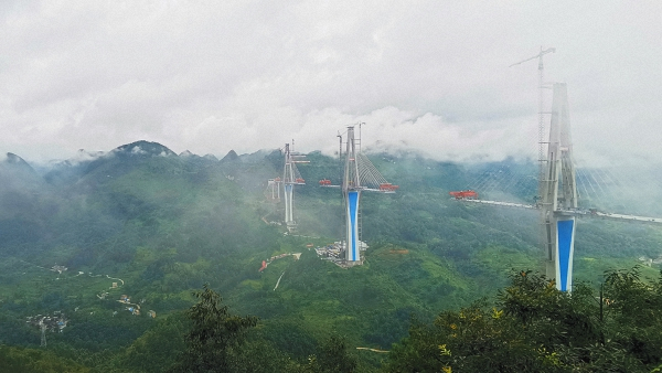 这座世界之最的特大桥主梁由140多个节段的钢梁拼接而成。重达160吨的巨大钢梁被架桥机吊起,经过回转、下落、微调等作业,精准完成钢梁的整体吊装和安装工艺。从空中俯瞰峡谷中的地面建筑,逐渐浓缩成玩具模型般大小。透过山间云雾,三座桥塔宛若巨型的“钻石”矗立在群山峡谷之间。