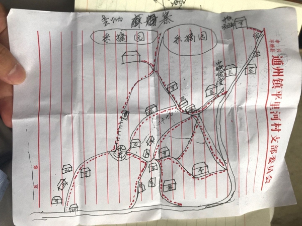 钟大方将拉湾组村民的愿望简单绘制在一张信纸上。图中规划了通往拉湾组每户人家门口的道路,其中一条道路与平塘特大桥观光服务区相连,路两旁还规划了采摘园……