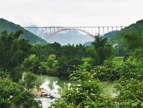 走进大小井风景区,碧绿清澈的河流穿过村中,岸边停着几片竹筏。抬头就是远处的大小井特大桥,如同一道通体赤红的彩虹。道路一侧是稻田,秧苗青翠茁壮,排列整齐,远处青山如黛;另一侧是一排农家乐店铺,门口各自贴着自家的招牌菜式。