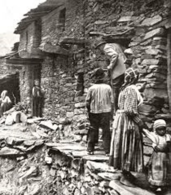 村子的大多数住房还保持了旧日模样,屋顶用薄石板层叠铺就,远远看去像是怪兽身上的鳞甲。许多房屋已经人去楼空,只剩下嶙峋的梁柱和倾颓的夯土墙。我发现还能住人的房屋门上都斜插着一束半干的橄榄枝,想找人询问,敲了几户都没人响应。终于,我等来了年近六十的奥尔登萨。她刚从附近山上下来,打算把几株野花移种到窗边的花盆里。她说这些橄榄枝是在圣周期间接受过祝福的,可以对抗暴风、冰雹、雷电、骤雨等极端天气。山村最怕的就是会引发山洪的暴风雨。