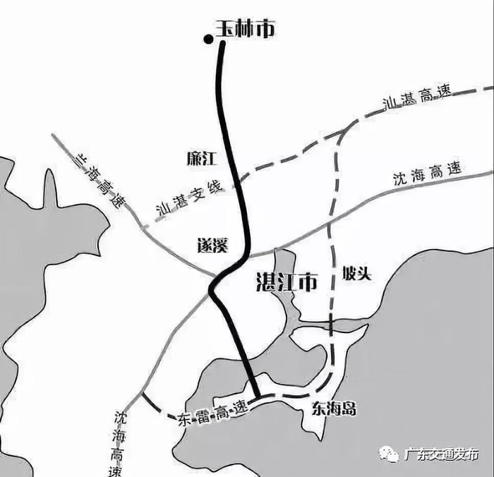 玉湛高速公路起于玉林至铁山港高速公路玉林南互通,终点在湛江市区环城高速及海西快线相接,全长约145公里,广东境内经廉江、遂溪、湛江市区跨海至东海岛。