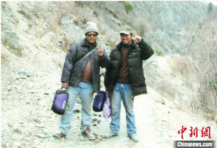图为2006年旺杰次仁(右)前往那曲索县江达乡徒步审查公路修建项目途中。西藏自治区交通运输厅供图
