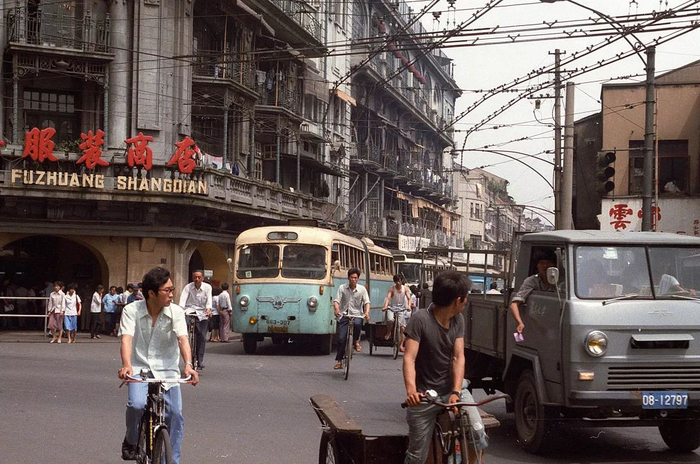 1984年,25路电车往东新桥方向行驶在浙江中路南京东路口,配车为SKD663型(John Scragg 摄)