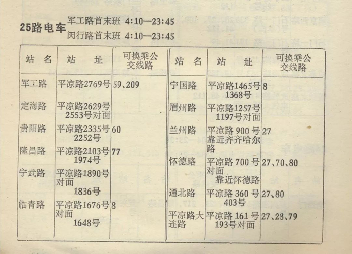 1990年公交手册:25路电车信息表