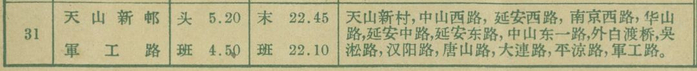 11路汽车与3路汽车(北京路外滩至延安西路凯旋路)两线合并为31路公共汽车,自平凉路军工路至天山新村。为当时市区最长线路。