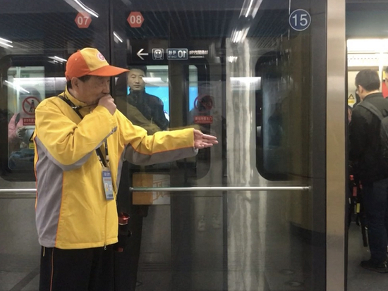 贺大爷生在北京,长在北京,对这座城市有很深的感情,退休之后,他发挥余热,成为了一名文明引导员,先是在巴沟站服务,后来又转到离家较近的海淀黄庄站,如今已经在这里服务一年多了。每天早晨7:30到9:30和下午5:00到7:00,贺大爷都会准时出现在站台上进行文明引导。“有点事情做,生活就很充实,也不觉得辛苦。”