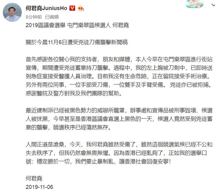 何君尧在文章中称,“首先感谢各位关心我的支持者、朋友和媒体,本人今早在屯门乐翠区进行街站宣传,期间遭受凶徒蓄意持刀袭击。过程中,我的左上胸被刀刺中,已及时送到急症室接受医护人员治理。目前我没有生命危险,正在留院接受手术治疗。另外有两位同事,一位手部受刀伤,一位双手及手臂受伤。 凶徒亦已被拘捕。感谢医院及警方对我及我们团队的帮助。”