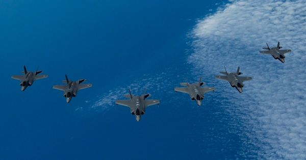 资料图片:来自美国、英国和以色列三国空军的F-35战机组成联合编队飞行。(图片来源于网络)