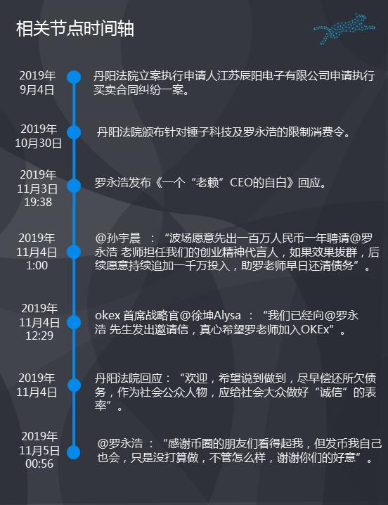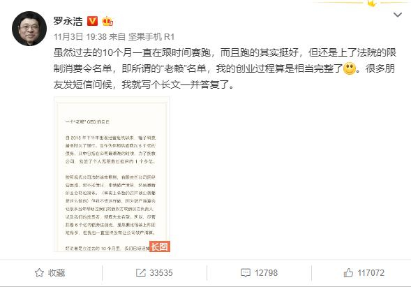 11月3日19:38,罗永浩针对此事发布长文回应:“虽然过去的10个月一直在跟时间赛跑,而且跑的其实挺好,但还是上了法院的限制消费令名单,即所谓的‘老赖’名单,我的创业过程算是相当完整了”。