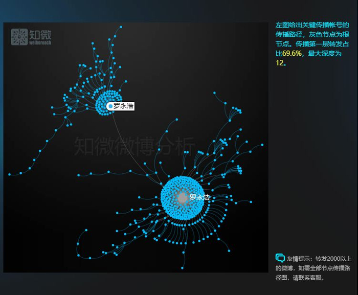 要说整件事热度爆发,离不开的还是罗永浩那封“一个‘老赖’CEO的自白”,知微传播分析数据显示,截至4日上午9时,该微博传播深度达12层,其中罗永浩的二次转发是重要传播节点。