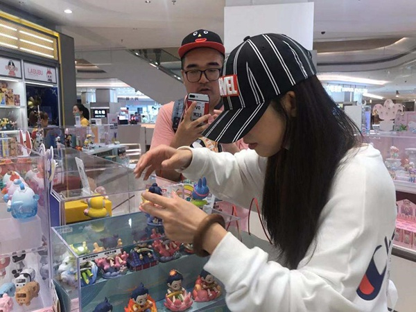 10月12日周六,上海松江区九亭镇一家购物商场里,大熊正带着自己的6位娃友在“扫店”。 在娃友眼中,“扫店”不仅是新手娃友认识盲盒最有效的方式,也能让娃友们互相交流盲抽经验。