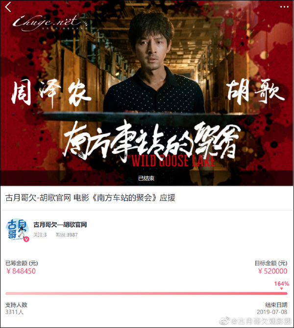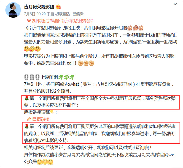 为了帮胡歌的新电影应援,其粉丝在6月成立了观影团@古月哥欠观影团,并在7月开启了集资应援活动。