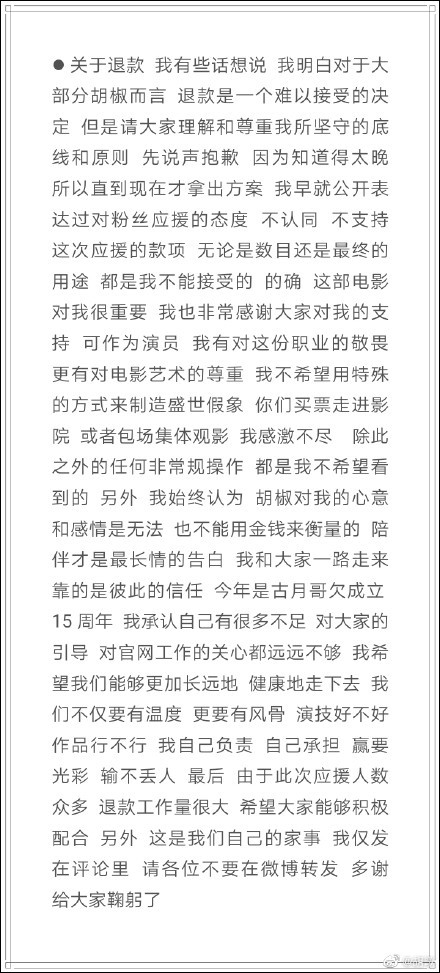 然而就在昨晚(11月6日),@古月哥欠观影团 发文表示将退还粉丝们为电影《南方车站的聚会》募集的捐款,因这样的行为违背了胡歌强调理智追星的初衷。