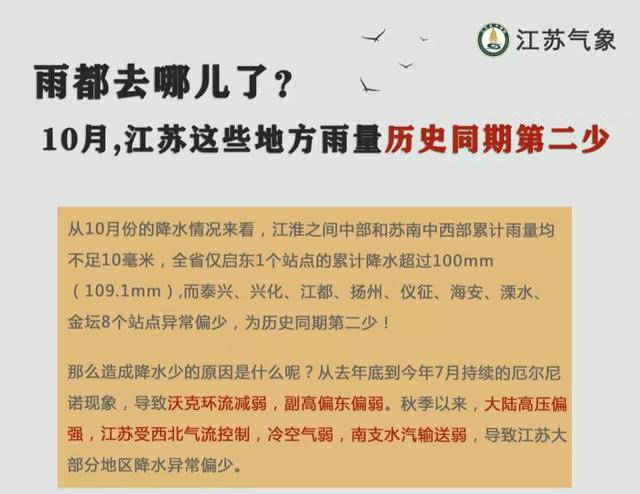 据江苏省气象台统计,从十月份的降水来看,江淮之间中部和苏南中西部累计雨量不足10毫米,降水异常偏少,仪征整个10月累计雨量只有0.5毫米,8个站点的累计雨量在历史极值的边缘试探。