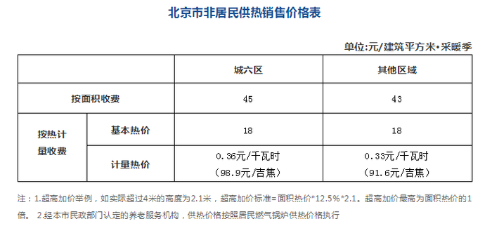 北京日报客户端记者梳理发现,非居民供热价格的收费计算方式有按面积收费和按热计量收费两种,其中按面积收费的,每建筑平方米统一上调3元,城六区、郊区非居民供热价格分别由现行的每建筑平方米42元和40元调整为45元和43元。