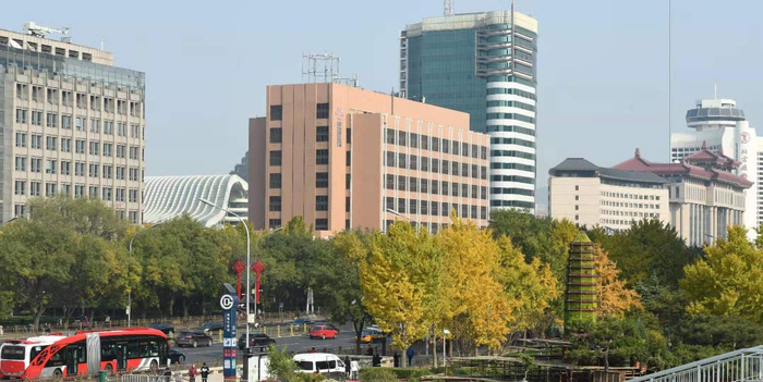 长安街上,金黄的银杏树点缀在绿树之间,成为风景中的风景。