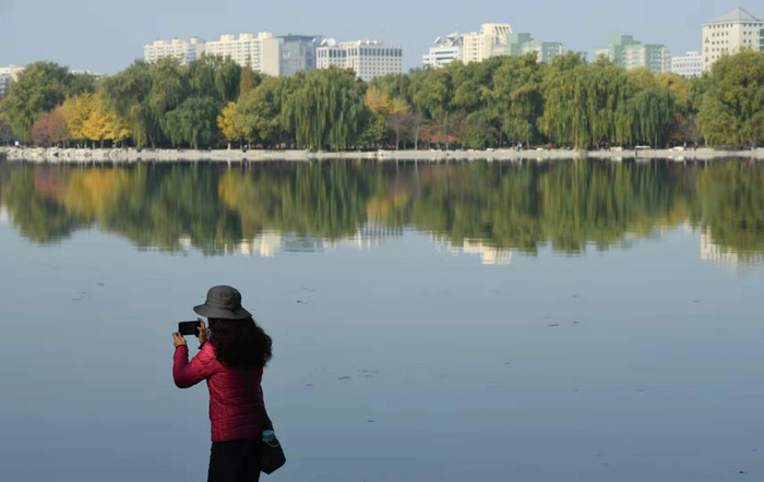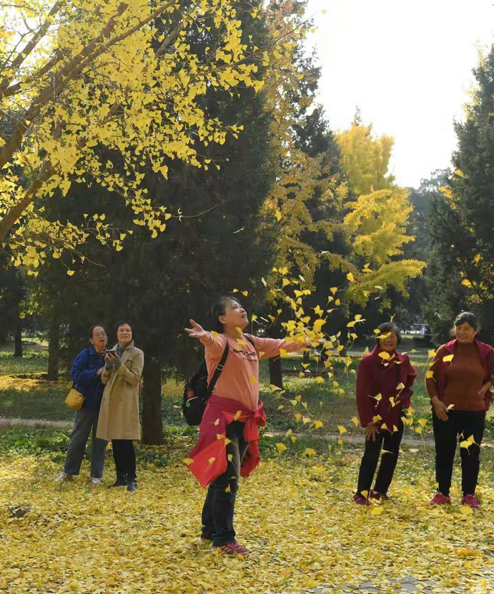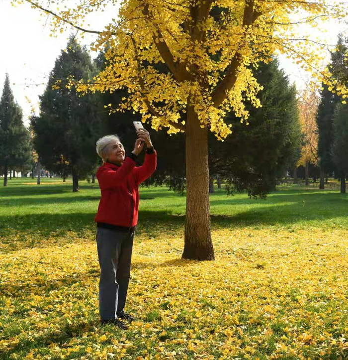 天坛公园,年近七旬的邹姓老人给金灿灿的银杏树拍照。"从春到秋,我看着它生长,一年一个样儿。”老人在北京生活了60年,常来公园健身看景。