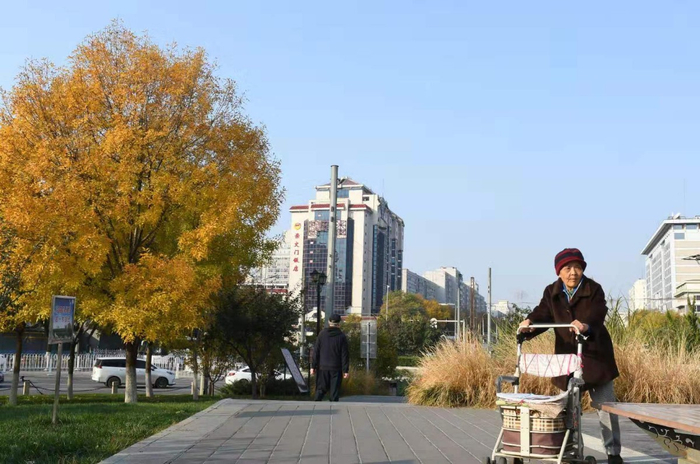 三里河路银杏林,市民漫步赏景,拍下银杏秋色。